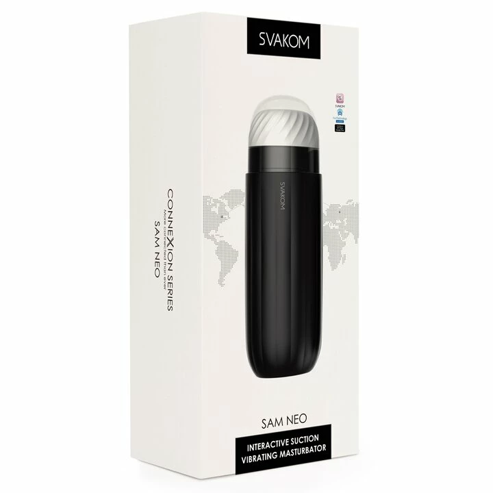 Experience intelligent pleasure with the Svakom Sam Neo 5 Function App Control Suction Vibrating Masturbator.Β